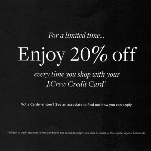 New and Existing J. Crew cardholders save an additional 20% on their purchase. Terms and conditions apply. See store for complete details.