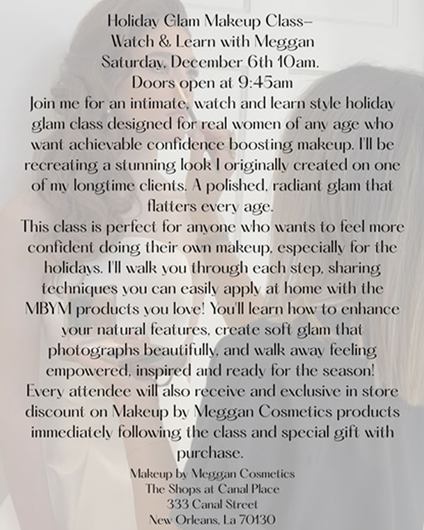 Attend an intimate, watch and learn style holiday glam class. The class is perfect for anyone who wants to feel more confident doing their own makeup, especially for the holidays. Meggan will walk you through each step, sharing techniques you can easily apply at home with the MByM products you love. You’ll learn how to enhance your natural features, create soft glam that photographs beautifully, and walk away feeling empowered, inspired, and ready for the season.